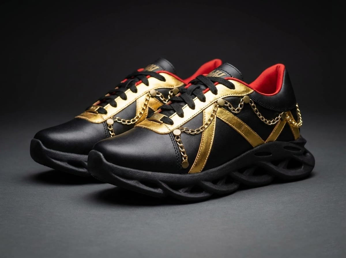 The Bezer Olympus Royalty embodies luxury and dominance. Featuring a deep black base with metallic gold accents, this sneaker delivers a bold and prestigious look. Gold chain details and a red inner lining enhance its exclusive character, making it a true statement piece for luxury streetwear.
